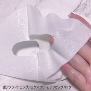 シミケアクリーム1本分をそのままパックに閉じ込めた「シミケアクリームラッピングパック」。めずらしいクリーム状のパックで、上下に分かれたシートタイプです。表面が布のような質感になっているので、ドライヤー中もベタつきを気にせず使えます。