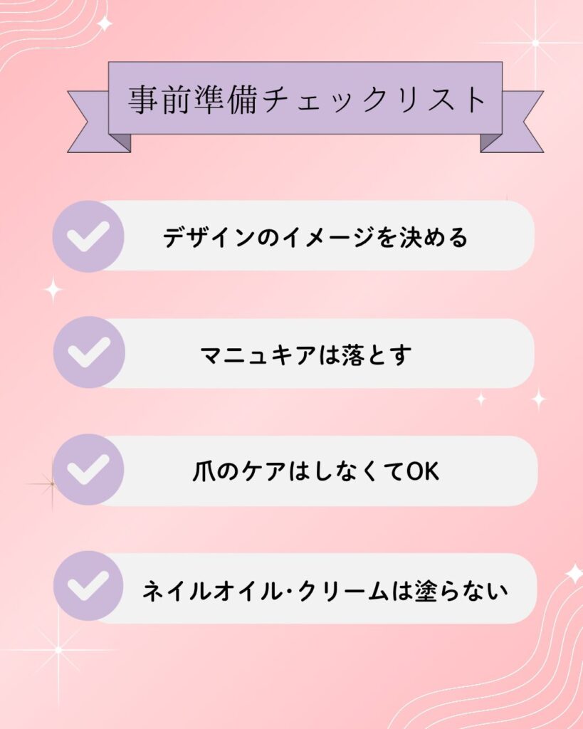 事前準備では、爪のケアをせず、何も手を加えない自爪の状態にしておきましょう。セルフケアをすると、かえって施術の妨げになる可能性があります。また、マニュキアは別途オフ代がかかるケースもあるので、自分で落としておくと安心です。