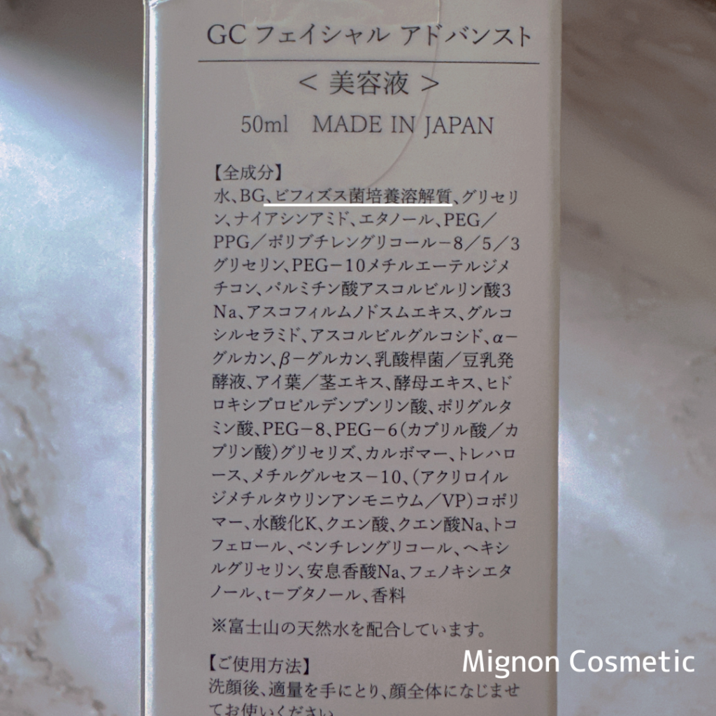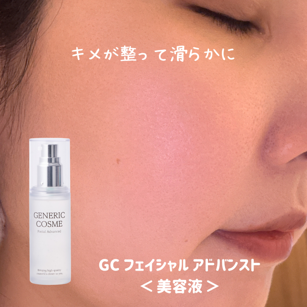 ジェネリックコスメ GC フェイシャル アドバンストは、化粧水の前に使用する導入美容液です。肌の土台7を整える「ビフィズス菌培養溶解質」がすこやかな肌に導きます。