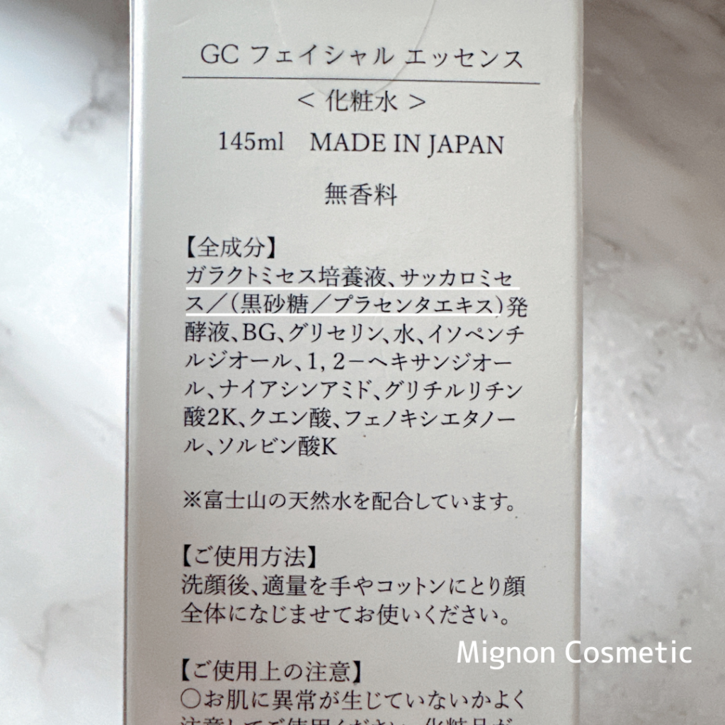 化粧品の成分表記は、配合量の多い順に並ぶ決まりがあります。GCフェイシャルエッセンスは、ガラクトミセス培養液が一番多く配合されている のが大きなポイントです!